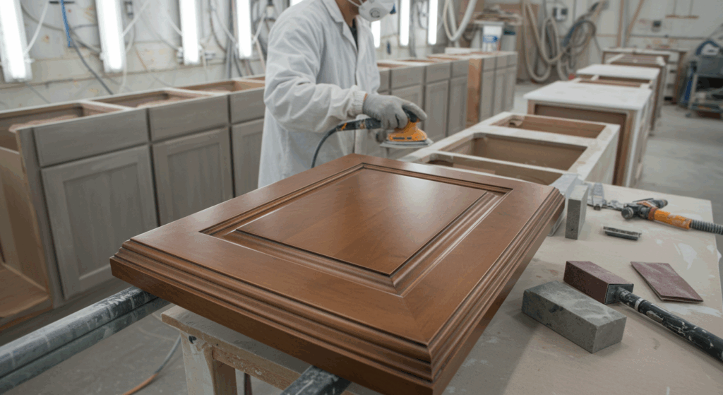 Once fully cured, doors and drawers are reinstalled with cleaned or upgraded hardware.